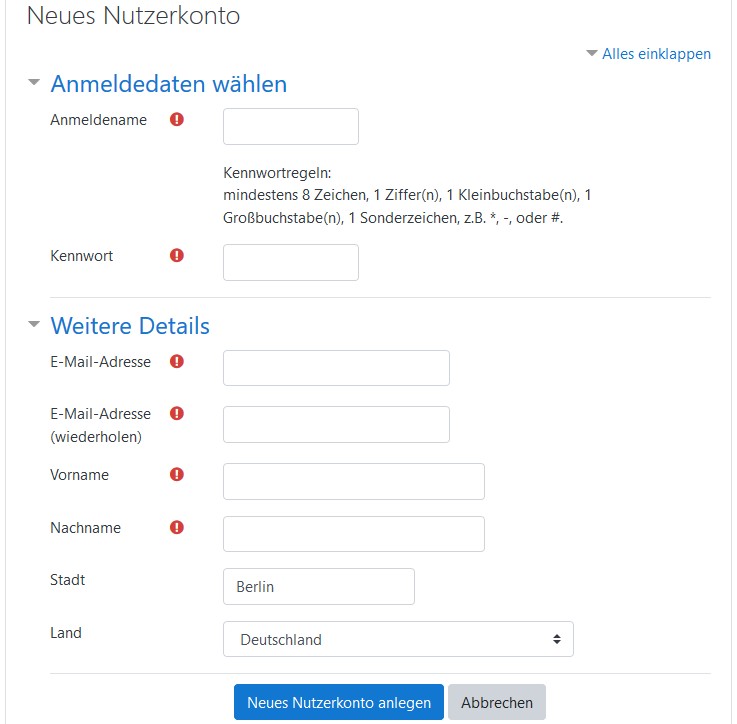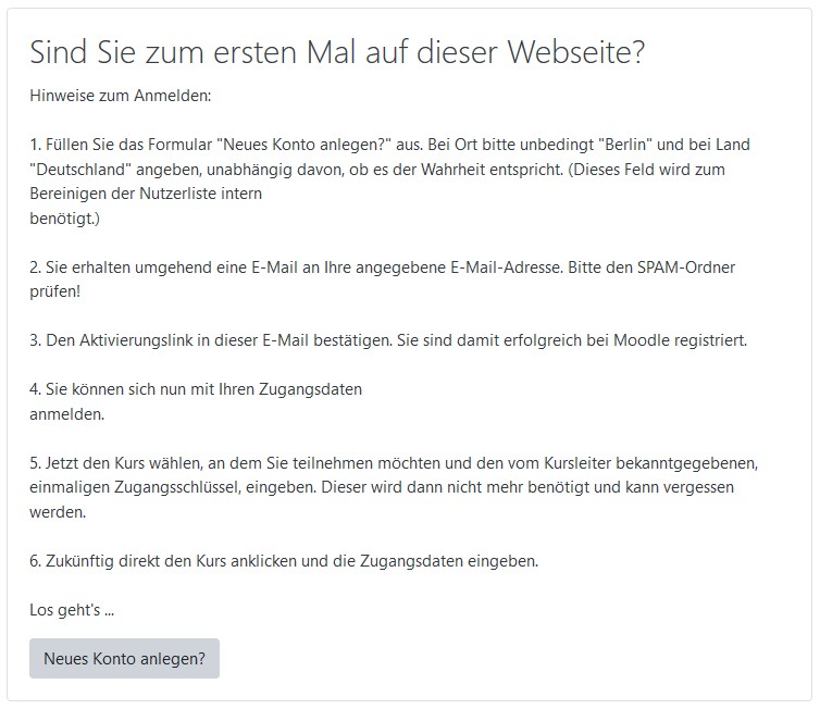 Alle Felder ausfüllen! Man beachte die Kennwortregeln! Bei Stadt/Ort bitte nur "Berlin" eintragen und Land "Deutschland". Egal ob es stimmt oder nicht. Mit diesem Feld wird die Nutzerliste von eventuellen Spamern befreit. Die empfangene E-Mail bestätigen (Link klicken!) und dann zukünftig nur Anmeldename und Kennwort eingeben. Das wars!