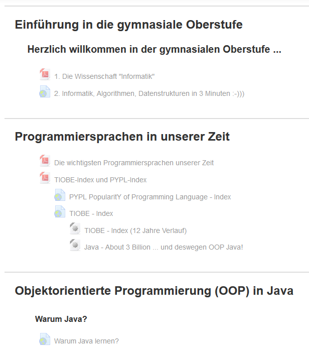 | Wie arbeite ich mit moodle? In jedem Kurs sind die Unterrichtsthemen als Themenblöcke aufgelistet. Am Anfang des Kurses findet man eine Gesamtübersicht mit den Themen, Sitzplan, Klausurtermin, Klausurschwerpunkten, Hinweise zur Referaten, Prüfung 5. PK usw.. ScreenCopy: